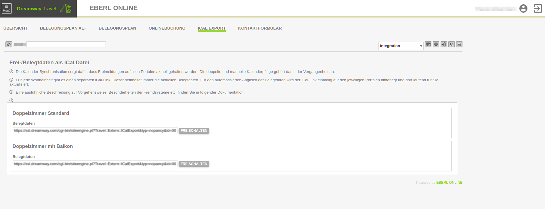 Den iCal Belegungsplan erreichen Sie in Ihrem Travel 2.0 Login-Bereich unter dem Menüpunkt „Integrationen“. Hier finden Sie für jede Wohneinheit / Zimmer einen eigenen iCal-Link. Diesen können Sie kopieren und in einem kompatiblen Fremdsystem hinterlegen. Zur Aktivierung des iCal-Links der jeweiligen Wohneinheit klicken Sie auf den Button „Freischalten“. Ab sofort werden alle Belegtmeldungen einer Wohneinheit in diesen Link exportiert.