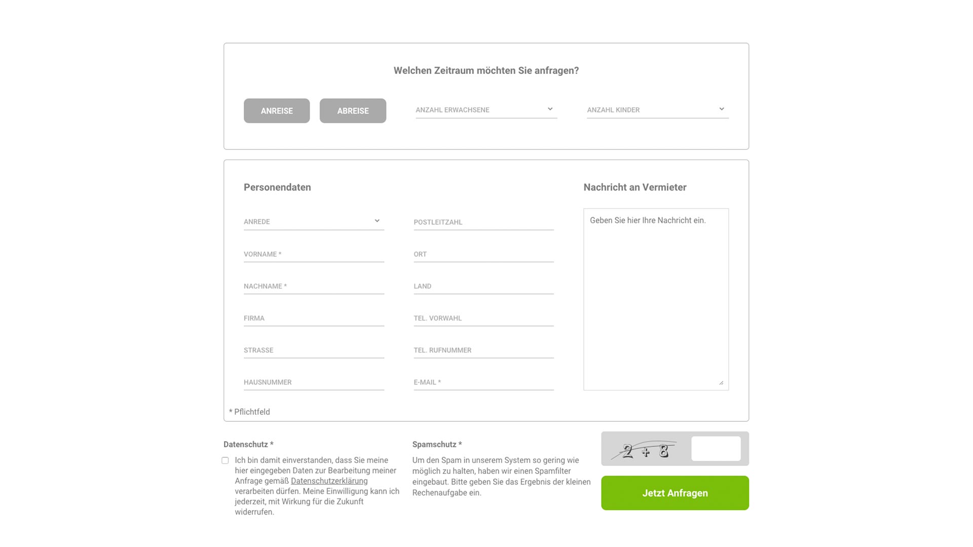 Ab sofort steht Ihnen das Kontaktformular zur Nutzung zur Verfügung. Kopieren Sie im Anschluss den Quelltext und übermitteln Sie diesen an Ihren Webseitenbetreiber zur Einbindung auf Ihrer Webseite. Die eingegebenen Adressdaten Ihrer Gäste fließen nun direkt in das Modul „Adressbuch“ und können dort bzw. in der Gästeverwaltung zur Angebotserstellung weiterverwendet werden. Zusätzlich erhalten Sie eine E-Mail-Benachrichtigung über die eigentliche Kontaktanfrage inkl. aller Details.